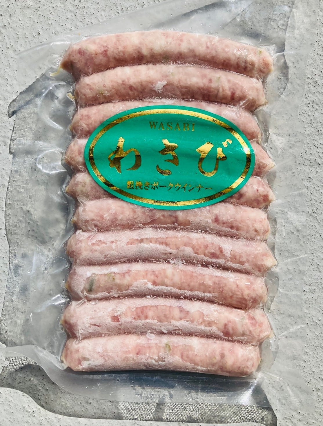 豚肉(国産)、わさび(国産)、食塩、糖類(水飴、ぶどう糖)、蛋白加水分解物/ソルビット、リン酸塩(Na、K)、調味料(アミノ酸等)、酸化防止剤(ビタミンC)、発色剤(硝酸K、亜硝酸Na)、くん液、香辛料抽出物(一部に大豆、牛肉を含む)