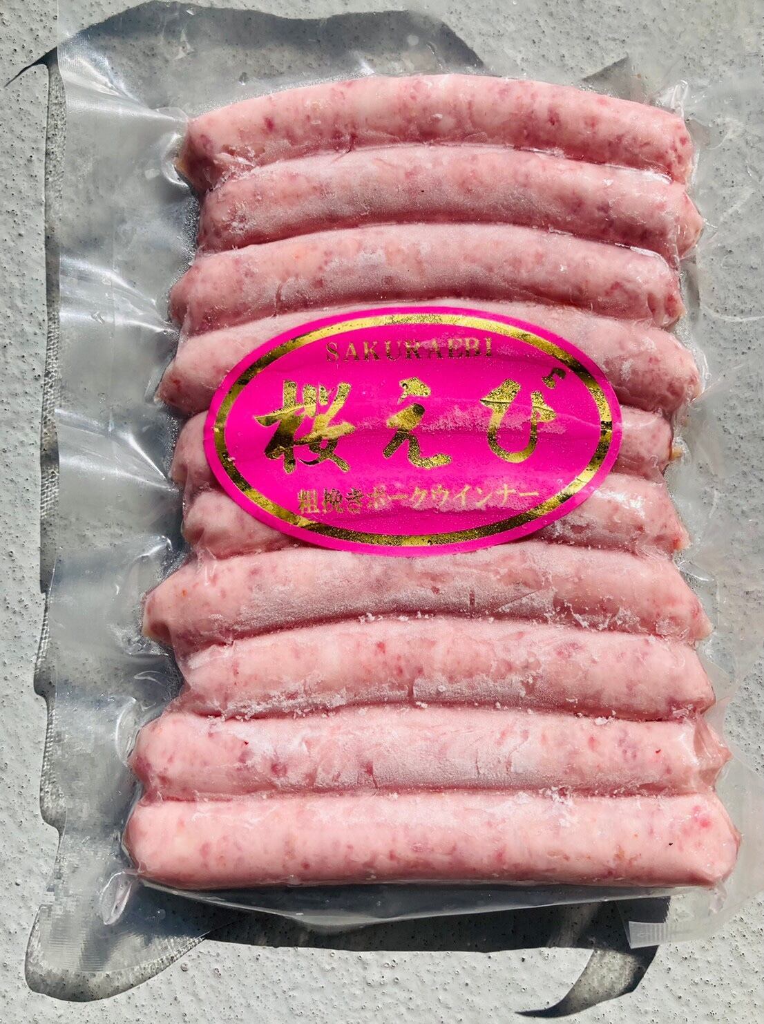 豚肉(国産)、桜えび、食塩、糖類、水飴、ぶどう糖)、蛋白加水分解物/ソルビット、リン酸塩(Na、K)、調味料(アミノ酸等)、酸化防止剤(ビタミンC)、発色剤(硝酸K、亜硝酸Na)、くん液、香辛料抽出物、着色料(コチニール)(一部に大豆・牛肉を含む)